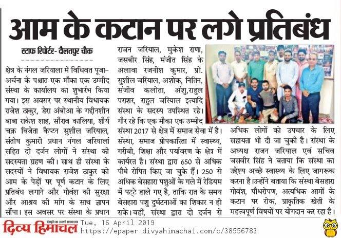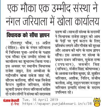 एक मौका एक उम्मीद संस्था के कार्यालय का शुभारंभ विधिपूर्वक से दिनांक 14.04.2019 को नंगल जरियालां में हुआ। इस अबसर पर आये सभी लोगों धन्यवाद |