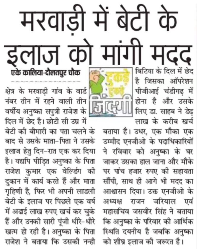 तीन साल की अनुष्का के दिल के छेद के ऑपरेशन की सहायता के लिये धन्यवाद। अनुष्का के लिये ऊना की कई संस्थायों ने योगदान दिया, जिनमे –