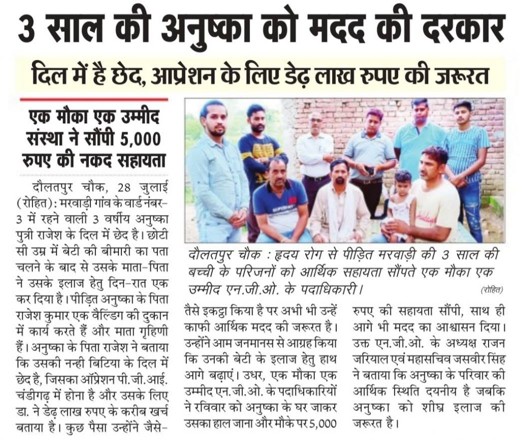 ?एक मौका एक उम्मीद (NGO)? 3 साल की अनुष्का को ₹50000 रुपए सहायता की जरूरत :- अनुष्का के दिल में छेद है, चंडीगढ़ पीजीआई में उपचार होना है। घर की आर्थिक स्थिति अभी इतनी अच्छी नहीं है। पिछले 1 साल से बच्ची का इलाज चल रहा है तकरीबन 2.50 लाख का खर्चा परिवार का हो चुका है। इस बच्ची के दिल का ऑपरेशन होगा डॉक्टर ने 1.50 लाख का खर्चा बताया है। 1 लाख परिवार ने इकट्ठा कर लिए हैं। पर इन्हें अभी पचास हजार रुपए की और आवश्यकता है। आज एक मौका एक उम्मीद (NGO) ने ₹5000 की मदद कर दी है। आप सभी के मदद से किसी को नया जीवन मिल सकता है इस नेक सेवा के भागीदार बनिए आप यह मदद एक मौका एक उम्मीद संस्था के माध्यम से सीधे इस परिवार तक पहुंचा सकते हैं Account Name : Ek Mauka Ek Umeed Account No. : 38581162242 IFSC Code : SBIN0009086 Bank Name : SBI, Gondpur Banehra H.P. Any Query Please Call NGO