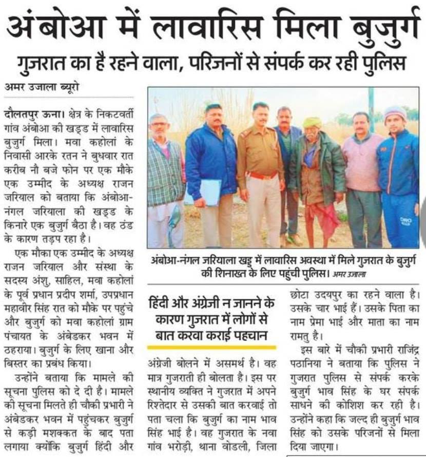 आज यह बुजुर्ग इतनी ठंड में अम्बोआ खडड् में लेटे हुए थे। मबा कहोला के उपप्रधान, पूर्व प्रधान और श्री आर के रतन जी बी संस्था के साथ उपस्थित थे। सभी ने मिलकर, इनको मबा कहोला अंम्बेदकर भवन में लेकर गए और वहां पर इनका रहने का इंतजाम किया और आज रात का खाना भी पहुंचा दिया गया। सभी से निवेदन है इन बुजुर्ग को उनके परिवार तक पहुंचाने की मदद करें।