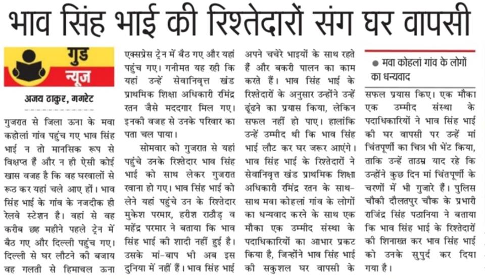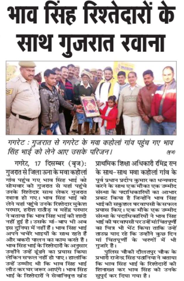 आज उसके परिवार के 3 सदस्य उसको बापिस ले के जा रहें हैं। संस्था ने इस मौके पर गुजरात से आये परिवार के सदस्यों को माँ चिंतपूर्णी की फ़ोटो भेंट की।