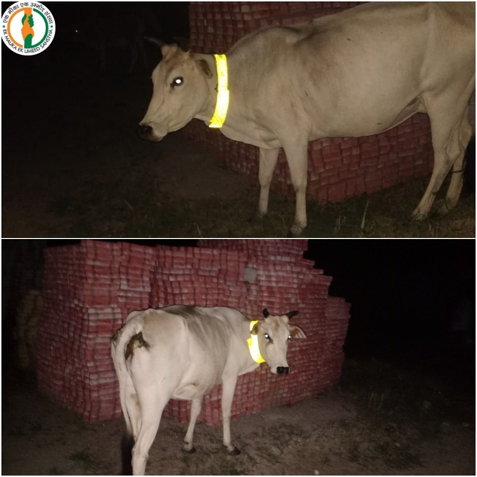रात को दुर्घटना से बचने के लिये बेसहारा गऊओं को रेडियम के पट्टे। ताकि दुर्घटनाओं से बचा जा सके।