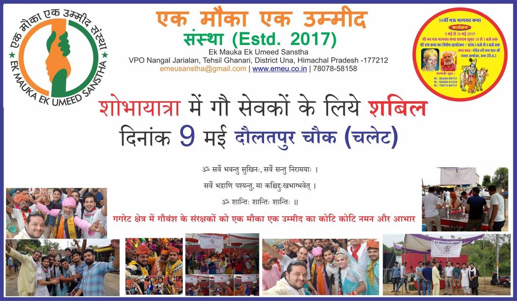 गगरेट क्षेत्र में ? गौबंश के संरक्षकों को एक मौका एक उम्मीद का कोटि कोटि नमन और आभार। 9 मई से 16 मई तक गौ भागवत महापुराण कथा के उपलक्ष्य में 9 मई को दौलतपुर चौक में शोभा यात्रा है। संस्था के सदस्य, शोभायात्रा में गौ सेवकों के लिये शबिल का प्रबंध कर रहे है।
