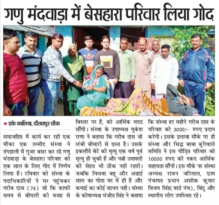 संस्था ने इस परिवार की मदद नवंबर 2018 में एकलौते बेटे की मृत्यु हो जाने के कारण आई आर्थिक मंदी से शुरू की थी। क्योंकि गरीबदास जी पहले से ही बीमार ओर बिस्तर पर थे। कुछ समय वाद उनकी भी मृत्यु हो गई। संस्था इस परिवार के साथ रही। अभी संस्था ने मासिक सहायता के तहत 1000 रु की सहायता की। संस्था के कई बरिष्ठ सदस्यों ने इस परिवार की सहायता के लिए आर्थिक योगदान किया था। गांव के लोगों ने भी योगदान किया था। संस्था, पिछले 7 महीनों से 19500 की सहायता कर चुकी है।