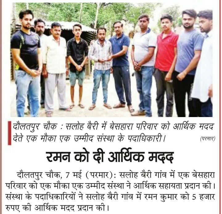 *आज एक मौका एक उम्मीद संस्था की तरफ से ₹5000 की मदद की गई और इस परिवार को संस्था की तरफ से आश्वासन दिया गया हैे आने वाले समय में किसी भी प्रकार की मदद होगी संस्था आपके साथ खड़ी है*