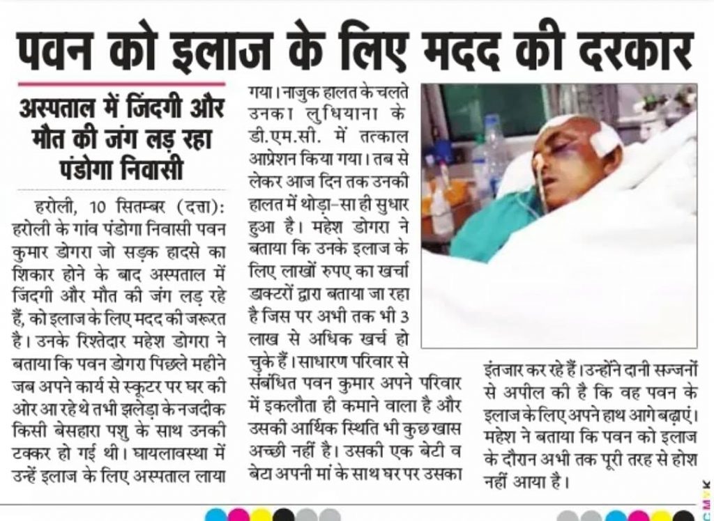 Pawan Kumar ji, DMC from Panduga is fighting life and death in Ludhiana. 10 days ago, he had an accident on the road. He used to work on a frying pan. For treatment of Pawan Ji, it will cost 9-10 lakh rupees. You can contribute to save the life of Pavan ji. Today, a chance a hopeful NGO has helped ₹ 10000. With the help given by you, you can save the life of Pawan Kumar Name-Seema Devi W / O Pawan Kumar Bank Name- PNB Bank Pandoga A / C No-1733000100095810 IFSC Code-PUNB0173300 ?8351966009,9810268124
