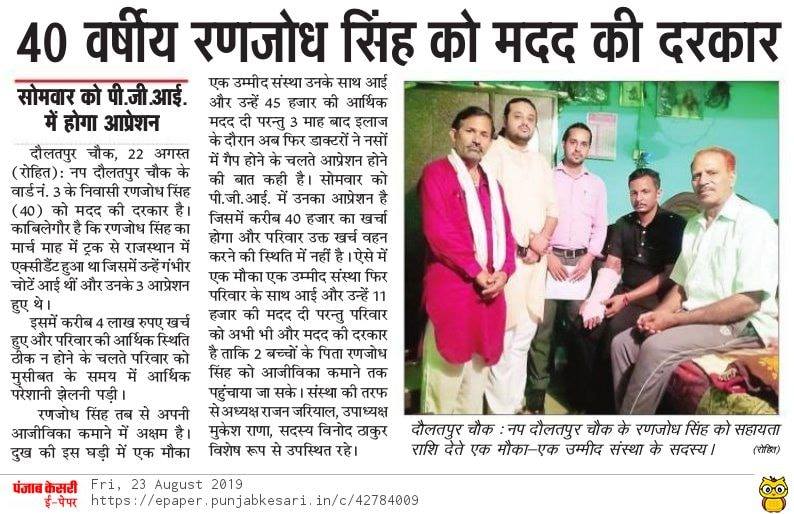 रणजोध सिंह को सहायता की 40,000 की जरूरत। रणजोध सिंह की दुर्घटना में बाजू और टांग में गंभीर चोटें आईं थी। इनका इलाज़ पर 4 लाख तक खर्चा आया था।
