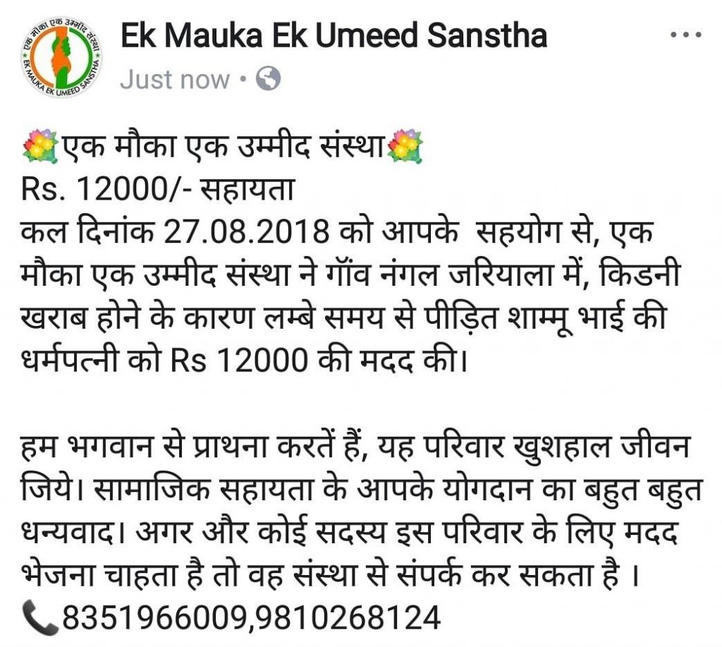 कल दिनांक 27.08.2018 को आपके सहयोग से, एक मौका एक उम्मीद संस्था ने गॉंव नंगल जरियाला में, किडनी खराब होने के कारण लम्बे समय से पीड़ित शाम्मू भाई की धर्मपत्नी को Rs 12000 की मदद की।