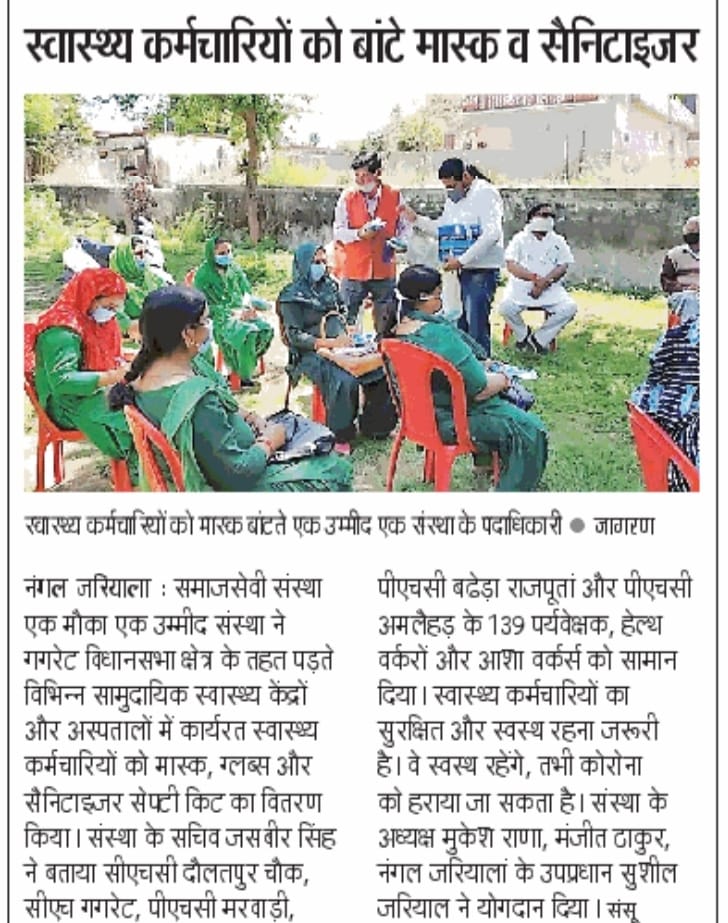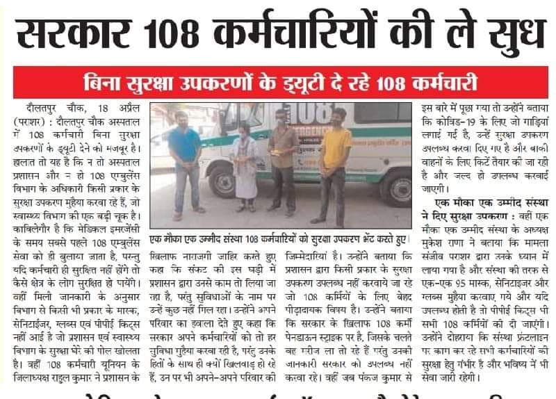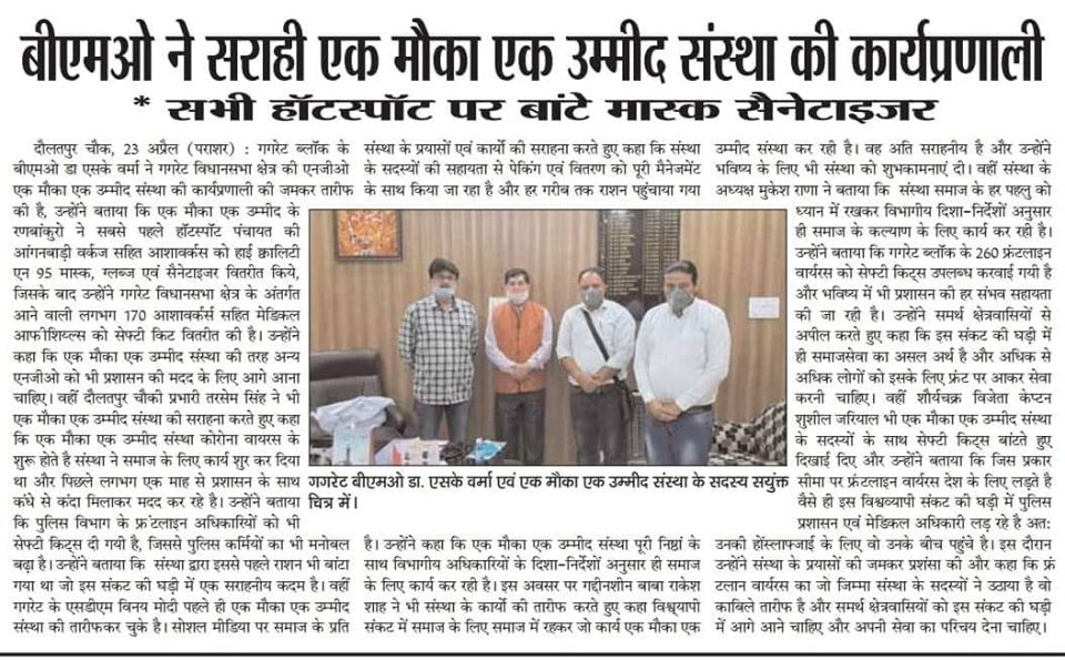 Ek Mauka Ek Umeed (Regd.) NGO are with front Front runner CORONA Warrior. हम mask, sanitizer ओर gloves के लिए सहायता करने वालों का धन्यवाद करतें हैं।